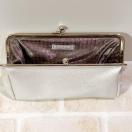 ホワイトメタリックで光沢があり、がま口の金具部分にランコムローズが刻印されています。