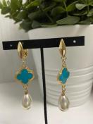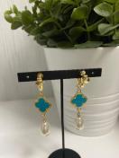 ブルーの花のパーツとパールビーズを使用したイヤリングになります。