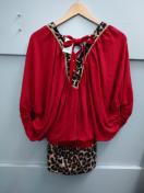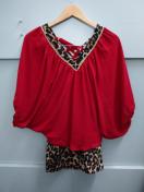 上は7分袖くらいでシフォン地(袖は広めでゆったりしたシルエット)、下はヒョウ柄でおしりの所がぴためです!
