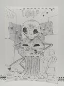オリジナルイラスト 手描きイラスト タコ宇宙人とグレイくん ハンドメイド 絵 原画 アナログ アート モノクロ 自作 インテリア