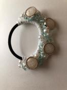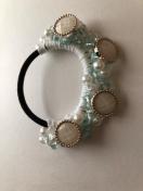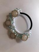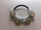 ボタンとキラキラビーズを盛り盛り編みこんで、ヘアゴムを作りました。