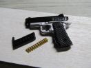 1/6スケール GIジョークールガール ACTION FIGURE用 玩具 COLT M1911改 デトニクス・コンバットマスター フレームSILVER 新品未使用!でございます。 1/6スケール GIジョー等フィギュア用アイテム玩具のルーズパーツでございます。 デトニクス社製のガバメントモデルで、小型ガバメントモデルの元祖でもある。しかし、ただ小型化しただけではなくいくつかの改良も加えられており、部品も本家コルト・ガバメントモデルとできる限り互換性を持たせてある。隠し持つのに丁度良い大きさであるため、アメリカの私服警察官などに使用された。ハンマーを素早く手で起こすために設けられた、スライド後端のスロープが特徴的。そのデザインから、日本ではコルト社製ガバメントモデルの短縮型と勘違いされ、「コルト・デトニクス」などと呼ばれることもあるが、コルト社製ではないのでこれは誤りである(コルト純正のそれは「ディフェンダー」と「オフィサーズ」 (実物の説明・仕様) ■サイズ■ 全長3cm程 スライド 多少可動 マガジン脱着可能 弾丸取り出し可能