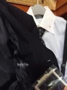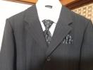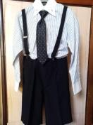スーツのポケットチーフと共布のネクタイ、パンツにはサスペンダーが付いてます。