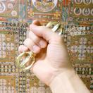 金剛杵(ヴァジュラ)は元々ヒンズーの神「インドラ」(日本名は帝釈天)の武器で、雷を操るとも言われ、 他にも金剛力士の武器としても知られています。 持ち手の両側に「鈷」(剣のようなもの)が出ており、「煩悩を打ち負かす」ものとされています。