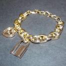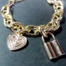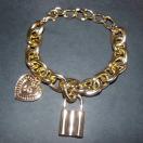 光沢のあるゴールド色のチェーンに、南京錠とハートのチャームが付いた素敵なブレスレットです。