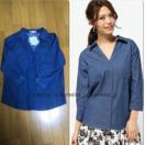 顔周りをシャープに見せるスキッパーネックが、品良くヌケ感を与えるデニムシャツ。