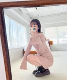 ミニ丈なので、ミニボトム×ブーツを合わせたスタイリングがおすすめ。