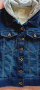 ┗フロント金色マットゴールドボタン開閉。ポケット2つ。ボタンで取り外し出来るフード付きで便利♪スウェットニット素材で柔らかくて軽くて動きやすくて楽チン♪綿コットンニットデニム生地の天然素材で洗濯機でジャブジャブ丸洗いOK!色落ちウォッシュドカラーが綺麗でボタンとステッチが映える♪お洒落可愛いGジャン長袖デニムジャケットです☆