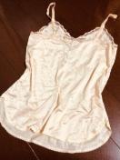 「Wacoal」ワコールキャミソール。落ち着いたピンク系ベージュのやわらかいカラーで綺麗な胸元レースの大人デザインなスリップキャミソール。