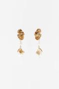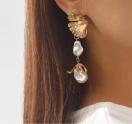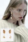 インパクトのある扇形の大振りメタルパーツ×フェイクパールがアシンメトリーにあしらわれてゴージャスな雰囲気のロングピアスです