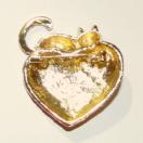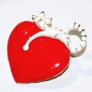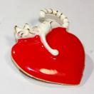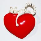 白猫が赤いハートにぶら下がっていて、可愛いバッジです。