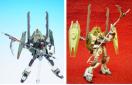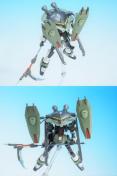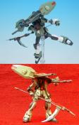 改造個所は首・肩・腰・股関節可動拡大、肘の強化(動きは渋みが出ましたが、動かすときにはずれやすさがあります)、バックパックが強襲形態時に位置が高すぎるので低くなるようにしています。武器の鎌は軟質素材を置換しました。手は武器持ち手しかなく、箱・説はありません。おまけでライフル(銃口改造品)をお付けします。写真で赤の背景のものは未改造品で比較のために使用しています。
