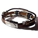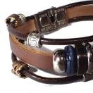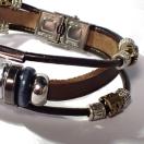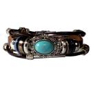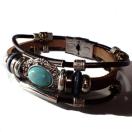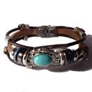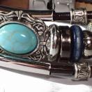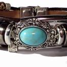 ターコイズブルー色の石に、銀色やブロンズ色の装飾された金具の付いたカッコいいブレスレットです。
