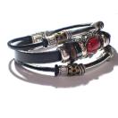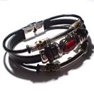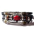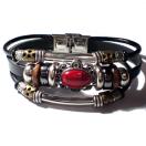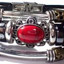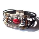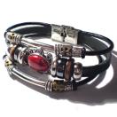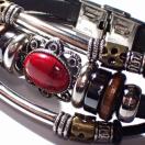 赤色の石に、銀色やブロンズ色の装飾された金具の付いたカッコいいブレスレットです。