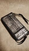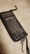 シルバーフォイル加工を施したスネークスキンを使用したラウンドジップロングレザーウォレットです。