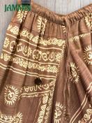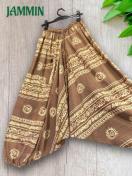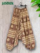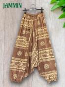 ブラウンの細かい織り柄生地ベースに、アジアン柄(オーム、太陽、植物、ブッダ足跡など)プリントしてあるアジアン柄サルエルパンツです。