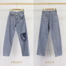 クロスになっているアンバランスのウエストデザインが特徴的なレディースクラッシュデニムパンツです、