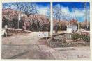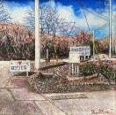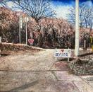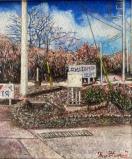 ずぅーっと最近まで(2022年)、今まで舗装されていなかった細い道路がついに舗装工事が始まり、車がすれ違うことの出来る道路になってしまったのですが、その工事の途中経過を何枚か描いた内の一枚です。あちこちに看板があって面白い風景だったのですが、この頃は工事に関する看板が殆どなくなり、何処にでもありそうな風景になっています。同じ場所を方向を変え、何枚も描いた中で自分なりに傑出した作品がサムホールのパネルに水張りで二枚あるのですが(看板だらけで面倒臭ぇー的な絵)それらは何処かの公募展に出品しようかなぁ? と検討中です。だからと言って、この作品がダメと言う訳でなく、構図なんかはとても気に入っていて、単なるコンクリートとアスファルトの混在する道路を絵に出来て満足しています(あまりこんな何の変哲の無い道路を描く人も居ないと思いますが)。あ、出品中の『石垣』がこの絵の暗く横切っている部分です(実は『石垣』は写真よりもっと濃い感じです)。
