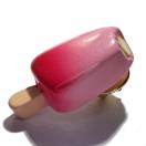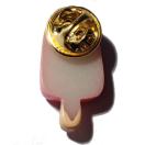 丸っこいアニメ調のピンク色のチョコのアイスで可愛らしいバッジです。