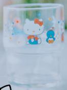 *夏の装いのハローキティとペンギンが描かれたグラス。