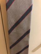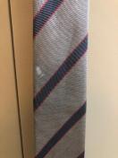 グレーベースの、ネイビーと赤の斜めのストライプ柄です。