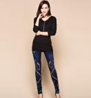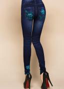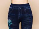 青い花柄のデニム風レギンスに切り込みを入れた個性的なレギンス。