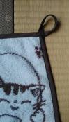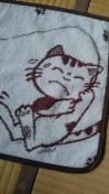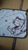 ハンドメイドのハンカチです。サイズは約32×34位です。周りをバイアスで巻いてます。引っ掛けが出来るようになっています。柄は猫が釣りをしています。何が釣れたかは、皆様のご想像にお任せです。今回は26枚限定です。