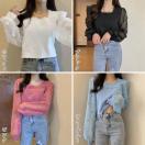 袖部分の異素材デザインは、トレンド感のあるスタイルを演出するスクエアネックニットトップスです