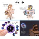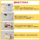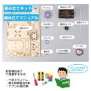 キット内容:組み立てマニュアル、組み立てキット(木製パネル、フィルム×3、電池ボックス、7mmネジ、電源スイッチ、結束バンド、凸レンズ、LEDランプ、輪止め、40mm鉄軸、ケーブル)