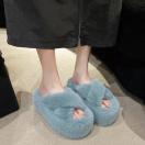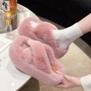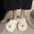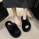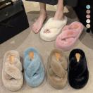 暖かくて柔らかい履き心地の良さをもたらし、もふもふの毛足の長いエコファーが大人可愛いクロスベルトサンダルです