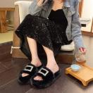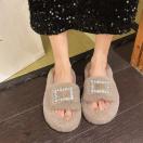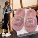 ふわふわのフェイクファー素材にゴージャスなスクエアバックルの飾りがついた、ファビュラスなルームシューズです