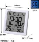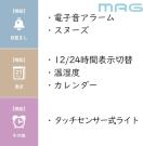 機能:カレンダー表示 (アラーム時刻表示切替)、温度表示、湿度表示、12/24時間表示切替、電子音アラーム、スヌーズ機能、タッチセンサー式バックライト