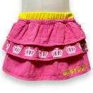 ピンクのダンガリーデニム素材にウエストはイエローのリブ切替になった3段フリルのティアードスカート