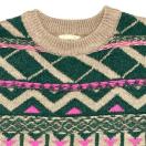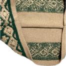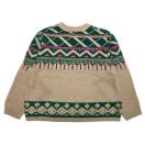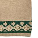 品質表示は、☆身頃→アクリル85%毛15% ☆グリーン柄部分→ポリエステル100% です。身頃はもっちり柄部分はフワフワ、肌に着いてもチクチクしない厚手のジャガードニットです♪。太めの襟リブやしっかり厚織りの裾周りもポイント♪。