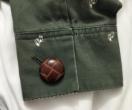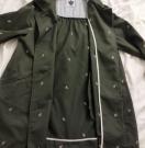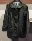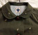 木の大きなボタンや刺繍の柄 丸襟 インナーのブルーのストライプなど、随所にかわいいが詰め込まれた 一枚仕立ての綿コート