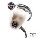 Alchemy Gothic の Dragon's Orb Claw フェイク イヤー ストレッチャー イヤリングは、アメジスト パープルのオーブをつかむドラゴンの爪と長い爪が特徴です。 Alchemy Gothicによるピューター製。通常のピアス用シングルピアスですが、一度挿入するとイヤーストレッチャーのように見えますのでご注意ください。 E325