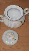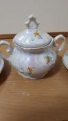 花のデザインとパールが綺麗なティーカップ、お皿、シュガーポットの3点セットです。