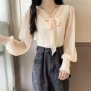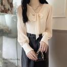 胸元の大きなリボンで一枚でもまたインナーとして着用していただいても上品に演出してくれるプリーツリブニットです
