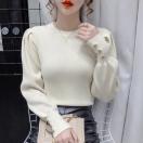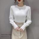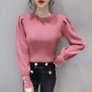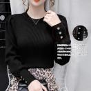 袖口に並んだパールのボタンが華やかなクルーネックニットトップスです