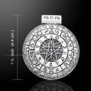デザインの中央には、五芒星と七芒星が重ねられた太陽の十字架が特徴です。最初の内側の段は惑星の日で、その次に月ごとの黄道十二宮が重ねられています。