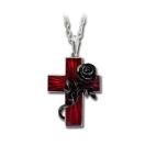 昼夜を問わず着用できるエレガントなアーティファクトです。半透明の深紅のエナメルの下にサンバーストの背景を持つラテン十字が、手作業でモデル化された黒いピューターのバラで覆われ、磨かれたピューターのベイルから吊り下げられています。重さ24g。チェーン53cm。