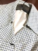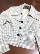 毛90の%の短丈ジャケットです。毛素材なので厚みもあり、しっかりとした作りになっていると思います。襟も大きくメインの方にはスタンド切り返しになっているので形が綺麗に出ています。若干スリムに見えて袖も長めなので、ラインが綺麗に見えると思います。前側にはサイドポケットが付いています。