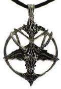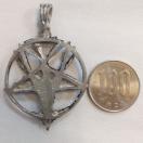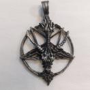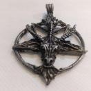 非常に詳細な山羊の頭が重ねられた逆五芒星。バフォメットのイメージを描いたこのお守りは、女神の男性的なバランスとして神を呼び出すのに役立ちます。アメリカ製。コードあり。ピューター。 1 1/4” AINVP