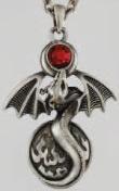最高級の鉛フリーのピューターから作られ、長さ 1 3/4 インチ、幅 1 3/8 インチのこのネックレスは、飛行中のドラゴンのイメージに形作られています。ドラゴンの燃えるようなリースを表す多面的な赤い宝石で先端にアクセントを付け、渦巻く炎でエッチングされた直径 3/4 インチのディスクで裏打ちされています。
