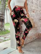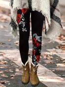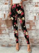ローズ花柄スキニーレギンス、カジュアルウエストゴム伸縮性レギンス、婦人服