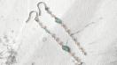 小さな水晶の欠片と水色のアパタイトをあわせたアシメデザインのロングピアスです。