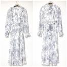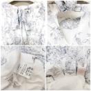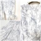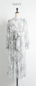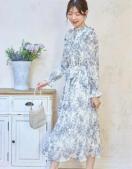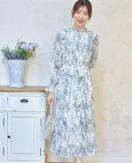 toccoclosetトッコクローゼットトワルドジュイフリルロングワンピースホワイトブルー白青りぼん付きサイドフリル装飾クラシカルアートプリントプリーツワンピースネイビー