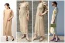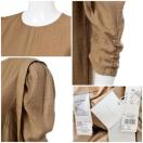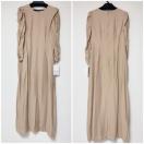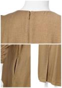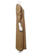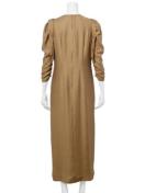 CELFORDセルフォードリネンライクタイトワンピースキャメルシルクツヤリブギャザーパフスリーブパワーショルダーパワショルストレートロングドレスワンピース艶オケージョン披露宴結婚式七分袖