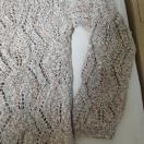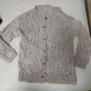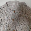 ピンクやブルーのニュアンス系の色が混ぜ込まれたミックスのリネン糸のレース編みのハンドメイドのカーディガン