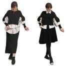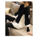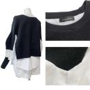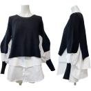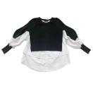 ひょうたん型のお袖がとっても可愛らしい重ね着風のトップス。ニット部分はしっかりとしたやや厚手です。裾のシャツはレイヤードになっているので、2枚とも出したり下の一枚だけインしたりとボトムとの相性やバランスで着こなしを変えられるのがとっても使いやすいです。Aラインのゆったりとしたデザインなのでパンツとの相性は抜群なのはもちろん、フレアースカートやロングスカートと合わせても素敵です。